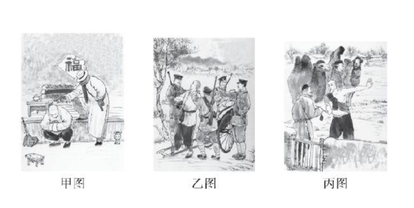 (1)进入展馆,同学们来到老舍先生的经典作品《骆驼祥子》巨幅图画前,围绕作品展开讨论。依据《骆驼祥子》原著,给下面三幅图画排序。